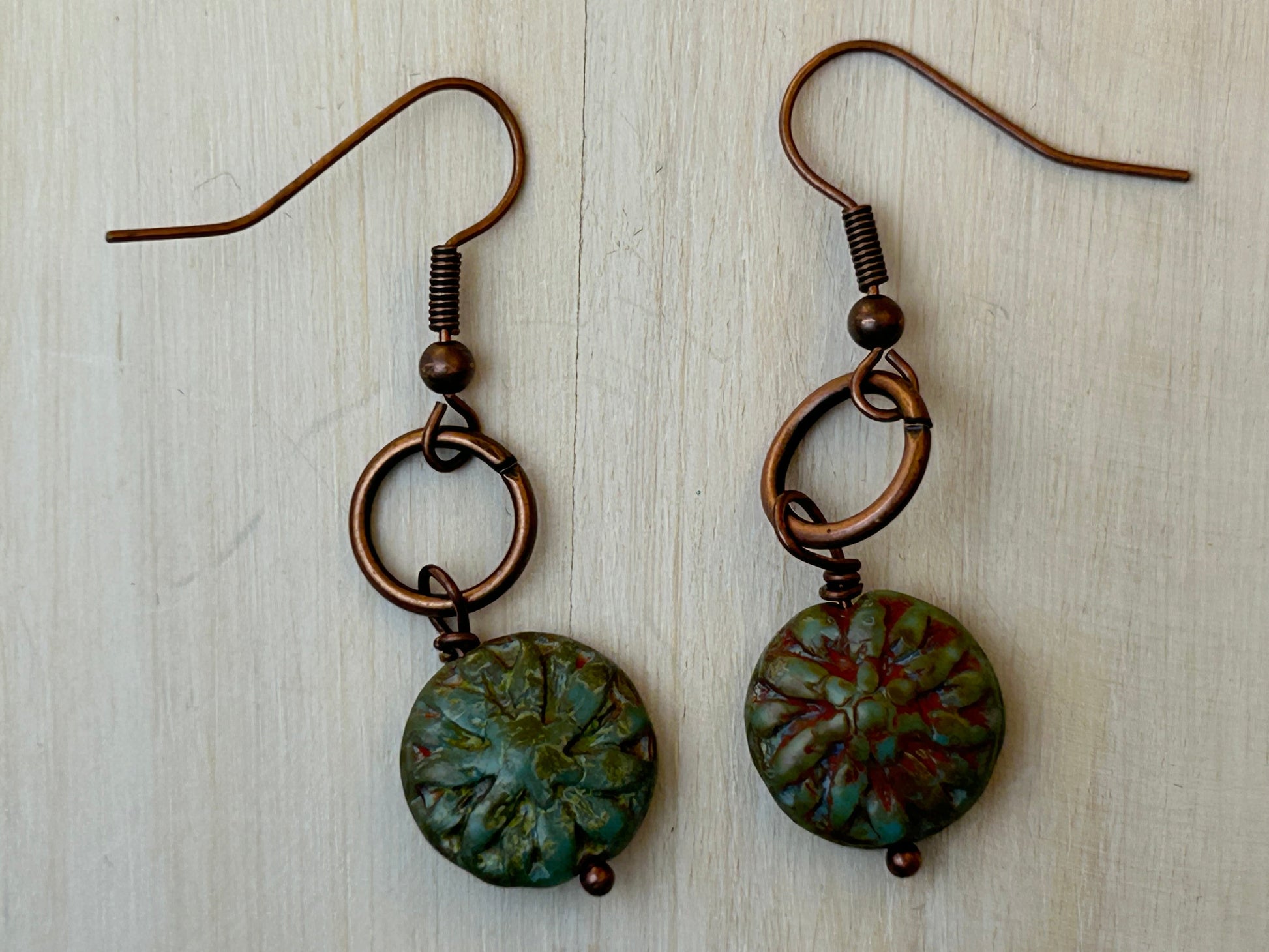 Copper and Green Czech Bead Earrings